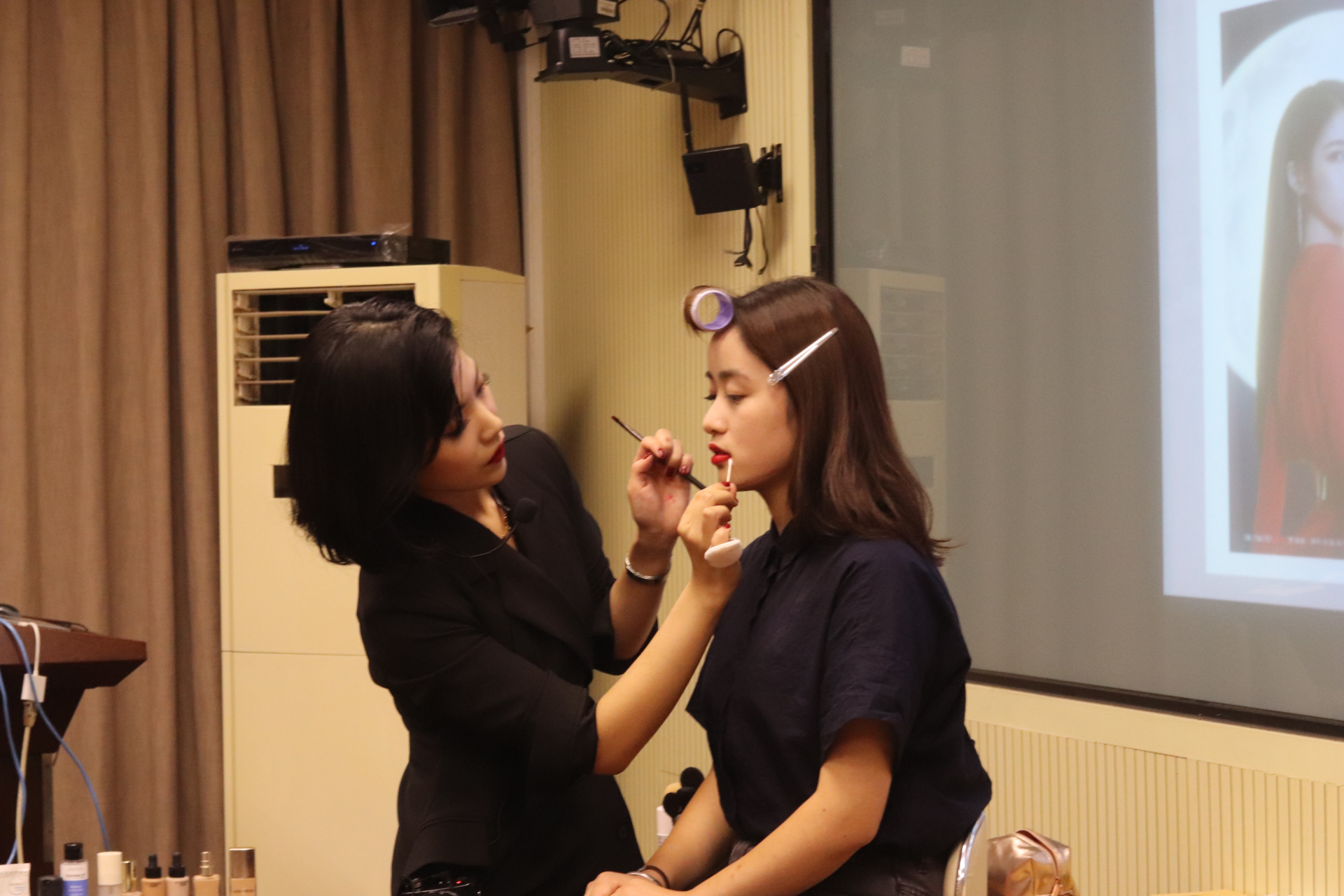 金老師(shi)以(yi)現(xian)場選中的同學(xue)為模(mo)特 ,對熱播劇《德魯納酒店》中的妝(zhuang)容進(jin)行了仿妝(zhuang)教學(xue)。